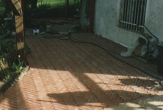 Pflasterung einer Hofzufahrt in Zwingenberg in Pflasterklinkern. Die Pflasterklinker 24*5,2 wurden hier hochkant im Fischgrätverband verlegt. Die Fertigstellung erfolgte in 1998. . |