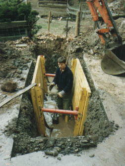 Hausanschluß für ein Einfailienhaus in Lautertal-Lautern. Ein zu durchquerender Bachlauf sorgte für Wasser im Kanalgraben. Hier wurden die Leitungen für Kanal und Wasser verlegt. Die Koordination mit den Versorgungsträgern übernehmen wir ab der Auftragsvergabe d.h. auch das Abklären der Anschlußlagen im Planungsstadium mit den Versorgungsträgern |